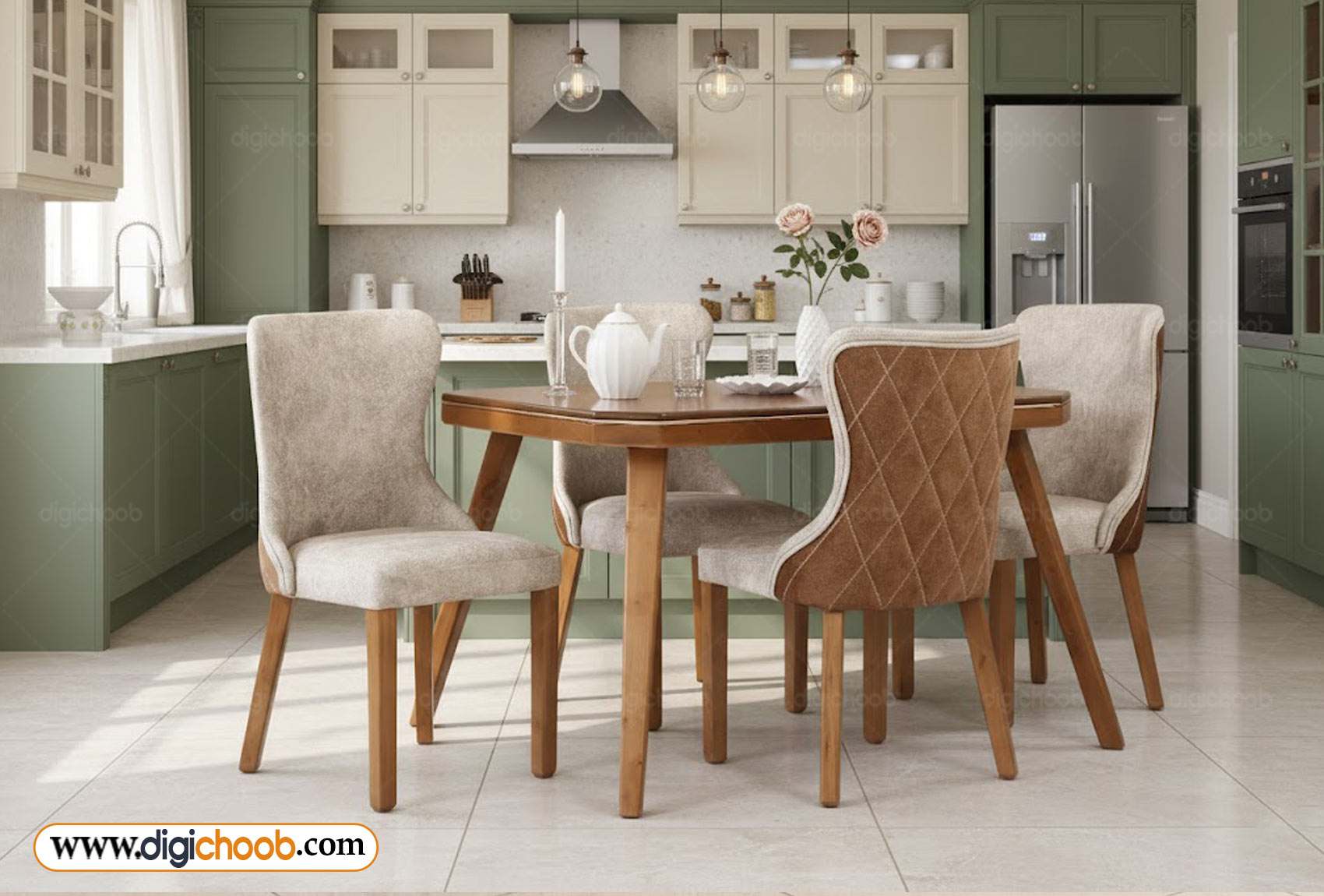 برای صفحه میز از ام دی اف استفاده شده و صندلی ها و پایه میز ناهار خوری سورنا از چوب روسی ساخته شده است. قابل تولید برای 4 و 6 و 8 نفر می باشد. همین طور می توانید رنگ چوب و پارچه را به دلخواه انتخاب کنید. جنس نشیمن صندلی ها اسفنج متراکم 25 کیلویی می باشد.