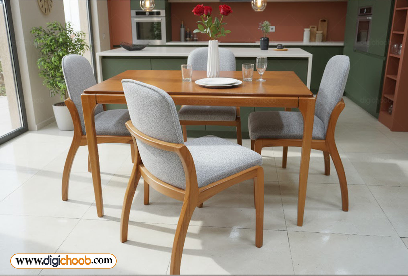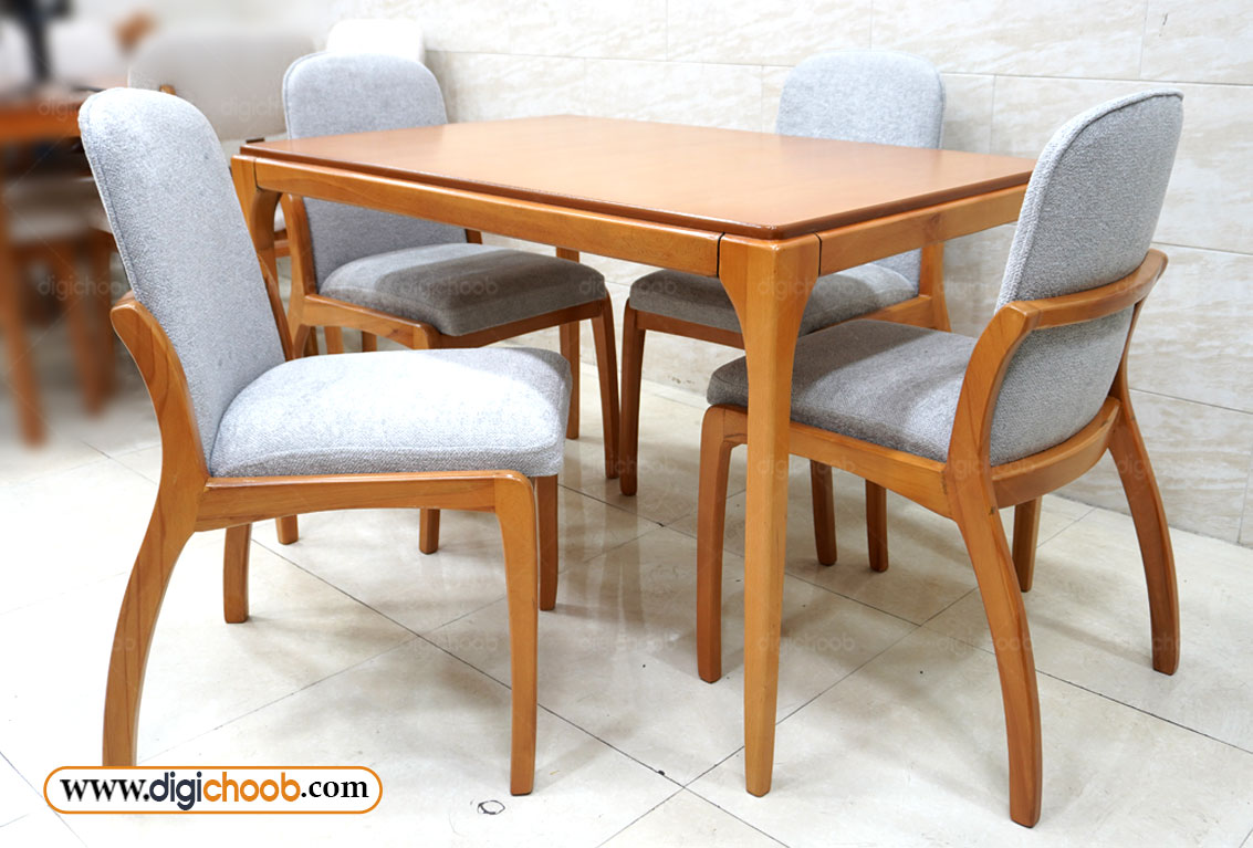 میز ناهار خوری کارما دارای پایه هایی از جنس چوب راش است. صفحه قرار گرفته بر روی میز نیز از جنس ام دی اف با روکش چوبی ساخته شده است. چهار پایه میز و دو پایه صندلی، در قسمت بالا دارای یک قوس هستند که آن ها را متمایز می کند. پشت صندلی از دو رنگ پاچه ساخته می شود.